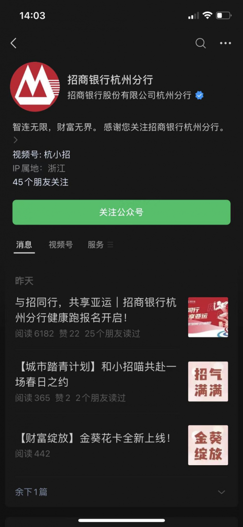 第一步:关注招商银行杭州分行微信公众号