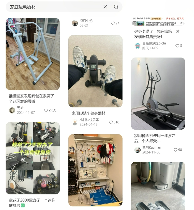 在小红书平台海量的运动内容中,不仅有“硬核专业人群”产出的聚焦赛场和运动员的讯息,也有泛兴趣人群分享的家庭亲子运动、业余运动、球衣球鞋穿搭等日常运动相关内容。例如仅下班后运动时间安排这一话题,在小红书就有超过1460万篇的相关笔记内容,球衣穿搭这一话题则是22万+,家庭运动器材为2万+。